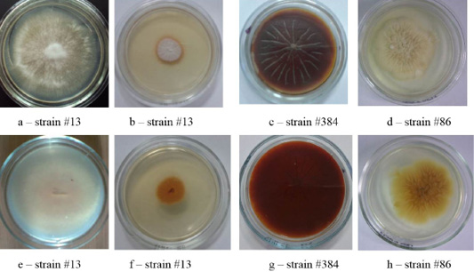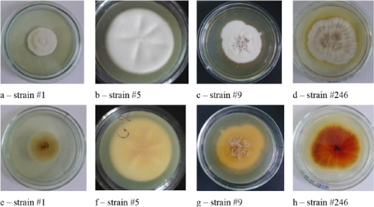 Clinical isolates of M. canis and T. tonsurans (strain #86). The Figure shows the front (a, b, c, d) and the reverse side of the colony (e, f, g, h).
