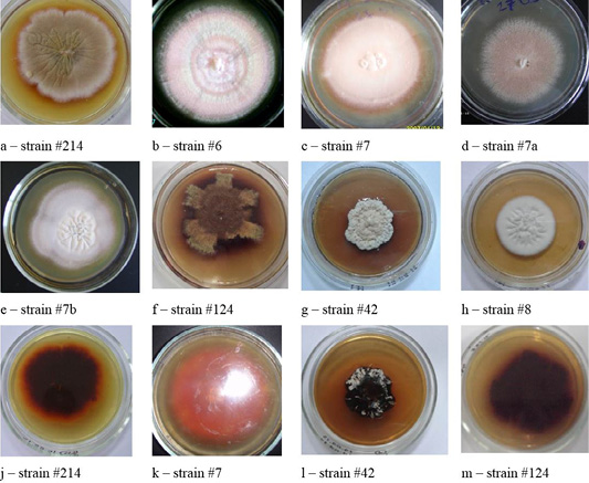 Colonies of clinical isolates of T. rubrum. Letters a, b, c, d, e, f, g, and h in the figure denote the front side, letters j, k, l, and m denote the reverse side of the colonies.