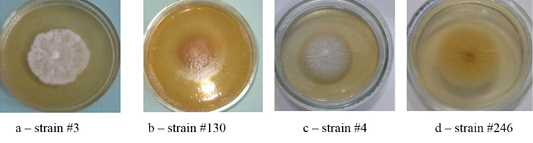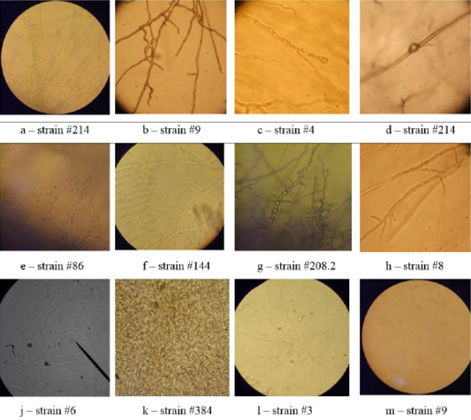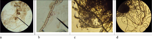 Morphological structures of microscopic fungi. Conidia (a) and mycelium (b) of micromycetes of Stemfyllium sp. #5.2; globular ascospores (c) and bristles (d) of Chaetomium globosum #129.