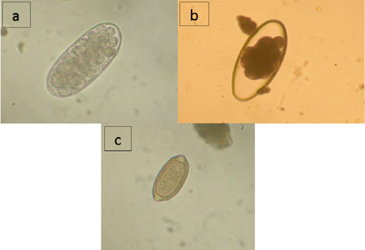 a) egg of Trichostrongylus; b) egg of Nematodirus sp.; c) egg of Trichocecpalus sp.