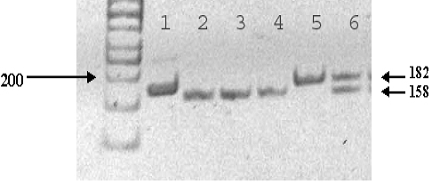An electrophoretogram of DNA typing of the bGHR-SspI polymorphism (Zhang 1993); Track 1 – PCR product of the 182 p.n. fragment of the bGHR-SspI gene; tracks 2, 3, and 4 – a fragment of the 158 p.n. restriction corresponding to the bGHR-SspIFF genotype; track 5 – a fragment of the 182 p.n. restriction corresponding to the bGHR-SspIYY genotype; and track 6 – fragments of the 182 and 158 p.n. restriction corresponding to the bGHR-SspIFY genotype. The fragment of 24 p.n. is not visualized. The authors used molecular mass marker O’Range Ruler TM 50 bp DNA Ladder, Fermentas, Lithuania. The positions of specific bands on the gel are shown by arrows. Electrophoresis was performed in 2% agarose gel (SeaKem LE Agarose, Lonza, USA).