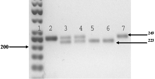 Electrophoretogram of DNA typing of the bIGF-1-SnaBI polymorphism (Kenny et al., 2011); Track 1 – molecular mass marker O’Range Ruler TM 50 bp DNA Ladder, Fermentas, Lithuania; track 2 – PCR product of the 249 p.n. fragment of the bIGF-1-SnaBI gene; tracks 3 and 4 – fragments of the 249 and 223 p.n. restriction corresponding to the bIGF-1-SnaBIAV genotype; tracks 5 and 6 – a fragment of the 223 p.n. restriction corresponding to the bIGF-1-SnaBIAA genotype; and track 7 – a fragment of the 249 p.n. restriction corresponding to the bIGF-1-SnaBIVV genotype. The fragment of 26 p.n. is not visualized. The positions of specific bands on the gel are shown by arrows. Electrophoresis was performed in 2 % agarose gel (SeaKem LE Agarose, Lonza, USA).