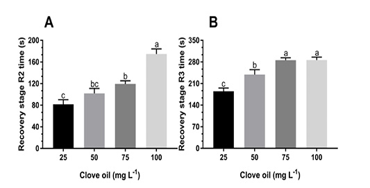 Partial recovery time (s) R2 (A) and total recovery R3 (B) at different concentrations of clove oil for tambacu juveniles (♂Piaractus mesopotamicus x ♀Colossoma macropomum). Values (mean ± SEM, n = 16) with different letters are significantly different between anesthetic agent concentrations.