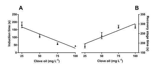 Relationship between deep anesthetic induction time (s) (A) and total recovery time (B) at different concentrations of clove oil for tambacu juveniles (♂Piaractus mesopotamicus x ♀Colossoma macropomum). Values are presented as mean ± standard error of the mean (SEM) (n = 16).