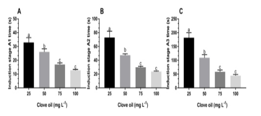 Time (s) to reach light sedation (A), light anesthesia (B) and deep anesthesia (C) stages at different concentrations of clove oil for tambacu juveniles (♂Piaractus mesopotamicus x ♀Colossoma macropomum). Values (mean ± SEM, n = 16) with different letters are significantly different between anesthetic concentrations.