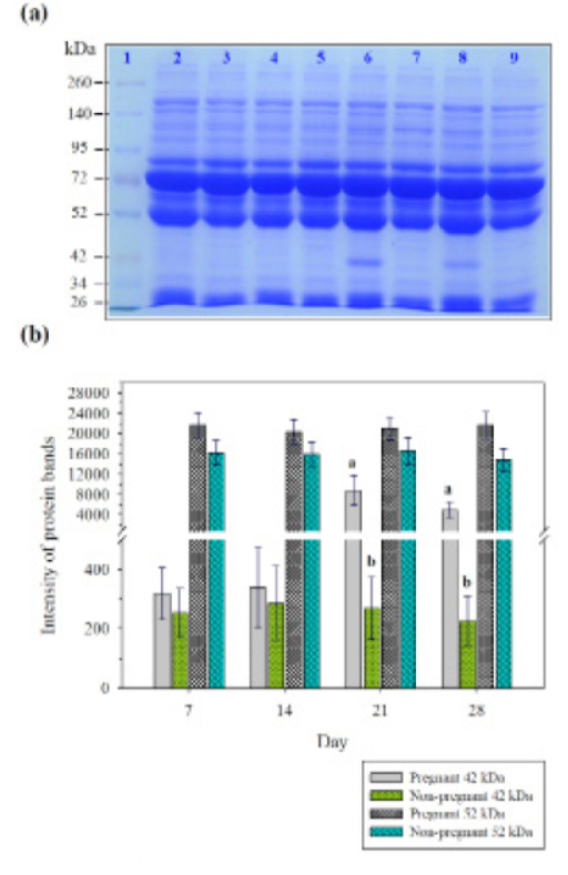 (A) Separation of serum proteins derived from pregnant and non-pregnant goat on day 7, 14, 21, and 28 of post-AI using polyacrylamide electrophoresis gel (SDS-PAGE). Lane 1; protein marker, lane 2; pregnant goat on day 7 post-AI, lane 3; non-pregnant goat on day 7 post-AI, lane 4; pregnant goat on day 14 post-AI, lane 5; non-pregnant goat on day 14 post-AI, lane 6; pregnant goat on day 21 post-AI, lane 7; non-pregnant goat on day 21 post-AI, lane 8; pregnant goat on day 28 post-AI, and lane 9; non-pregnant goat on day 28 post-AI. (B) Intensity of protein bands (42 and 52 kDa) using ImageJ software analysis.