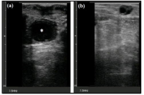 Using ultrasonography to confirm pregnancy in goats 45 days after artificial insemination. A) Pregnant and b) Non-pregnant.