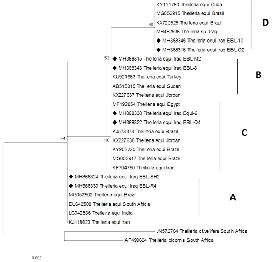 Rooted phylogenic tree of Theileria equi as interfered from partial sequences of 18S rRNA gene. Black diamond indicated sequences obtained from the present study; others represent sequences from Genbank.