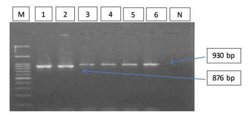 Gel electrophoresis image showing; PCR detection of B. caballi and T. equi with a pair of universal screening primers (Bec-UF1 and Bec-UR): Lanes M) 100 bp ladder DNA marker; Lane 1-2) B. caballi in approximately band size 876bp; lane 3-6) T. equi in approximately band size 930bp; Lane N) negative control.