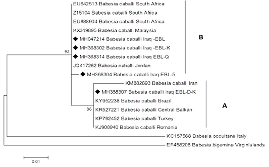 Rooted phylogenic tree of Babesia caballi as interfered from partial sequences of 18S rRNA gene. Black diamond indicated sequences obtained from the present study; others represent sequences from Genbank.