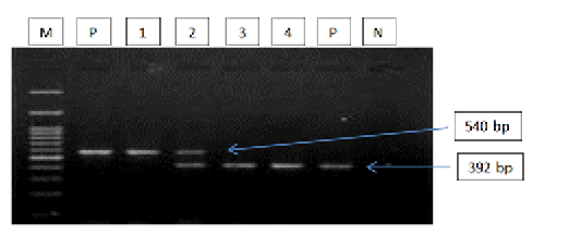 Gel electrophoresis image showing: lane M) 100bp DNA ladder; Lane P) positive control for T. equi and B. caballi; Lane1-4) multiplex PCR detected T. equi and B. caballi in approximately band size 392 and 540 bp respectively; Lane N) negative control.