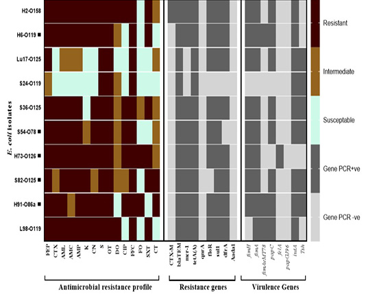 Antimicrobial resistance and virulence genes constellation in the selected E. coli isolates recovered from broiler chickens.