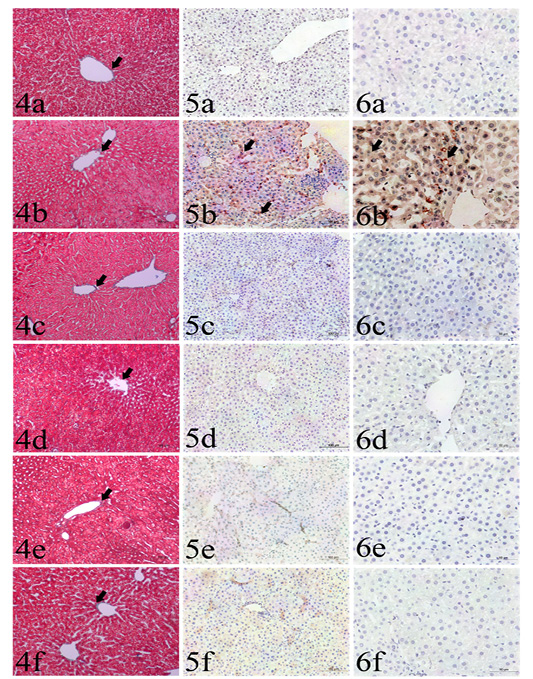 Sections liver stained with: Fig. (4): Masson’s trichrome from different groups used for collagen fibers identification (arrows), including GI (4a), GII (4b), GIII (4c), GIV(4d), GV (4e) and GVI (4f). Masson’s trichrome x200. Fig (5): Caspase 3 immunohistochemistry expression (arrows) among the examined groups including GI (5a), GII (5b), GIII (5c), GIV (5d), GV (5e) and GVI (5f). IHC x200. Fig. (6): TNF-α immunohistochemistry expression (arrows) among the examined groups including GI (6a), GII (6b), GIII (6c), GIV (6d), GV (6e) and GVI (6f). IHC x400.