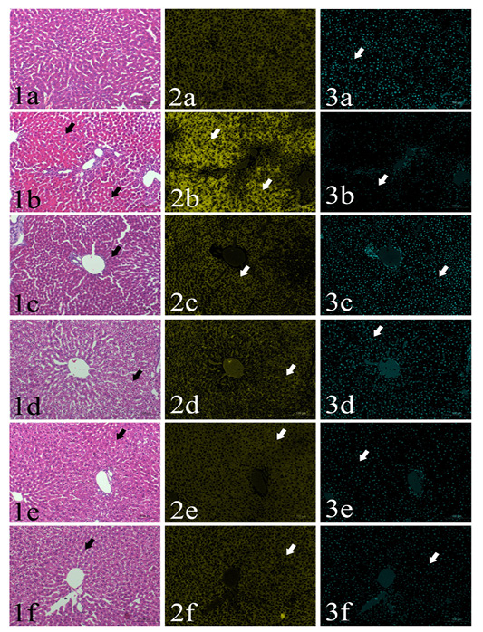 Sections of rat’s liver routinely stained with Hematoxylin and Eosin stain (1st column) showed focal cytoplasmic acidophilia (arrows) in different groups including GI (1a), GII (1b), GIII (1c), GIV (1d), GV(1e) and GVI (1f). HE x200, and their corresponding yellow stacks (2nd column) used for measuring cytoplamic color (arrows) in different groups including GI (2a), GII (2b), GIII (2c), GIV (2d), GV (2e) and GVI (2f), and Cyan stacks (3rd columns) used for measuring nuclear chromatin area percentages (arrows) in different groups including GI (3a), GII (3b), GIII (3c), GIV (3d), GV (3e) and GVI (3f),