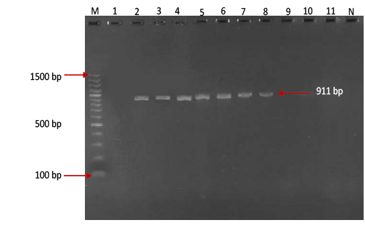 Gel electrophoresis image showing Lane M ) Exact Mark 100 – 1500 bp DNA ladder, Lane 2-8) conventional PCR technique detecting genotype Asia-1 of FMD virus in approximately band size 911 bp. Lane1,9,10,11) are negative results, Lane N) DNA extracted from FMDV-free cattle used as negative control.