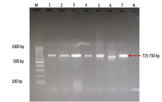 Gel electrophoresis image showing Lane M) Exact Mark 100 – 1000 bp DNA ladder, Lane 1-7) conventional PCR technique detecting only genotype SAT of FMD virus in approximately band size 715- 730 bp. Lane N) DNA extracted from FMDV-free cattle used as negative control.