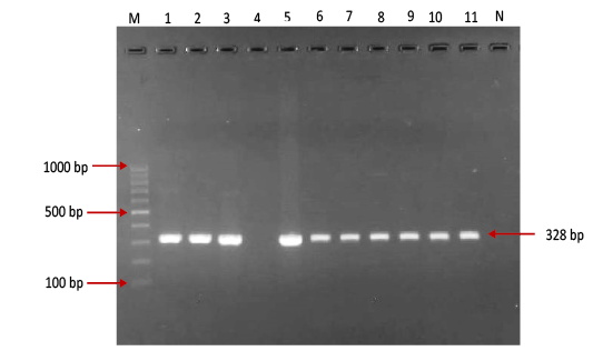 Gel electrophoresis image showing: Lane M) Exact Mark 100 – 1000 bp DNA ladder, Lane 1-11 except 4) conventional PCR technique detected all possible FMDV in approximately band size 328bp. Lane 4) is negative result, Lane N) DNA extracted from FMDV-free cattle used as negative control.