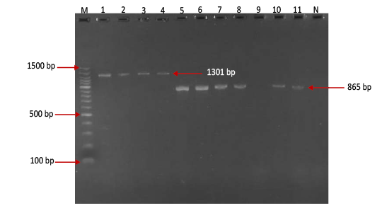 Gel electrophoresis image showing Lane M) Exact Mark 100 – 1500 bp DNA ladder, Lane 1-4) conventional PCR technique detecting genotype O of FMDV in approximately band size 1301 bp. Lane 5-11except 9) conventional PCR technique detecting genotype A of FMDV in approximately band size 865 bp, Lane 9) is negative result, Lane N) DNA extracted from FMDV-free cattle used as negative control.