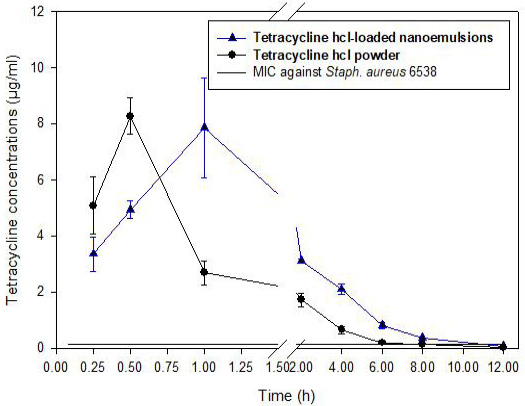 The time concentration relationship of Tetracycline hydrochloride (TC-Powder) or Tetracycline loaded nanoemulsion (TC-NE) after oral administration (50 mg/kg b.wt) in white new zealand rabbits. (Mean ± SD, N=8).