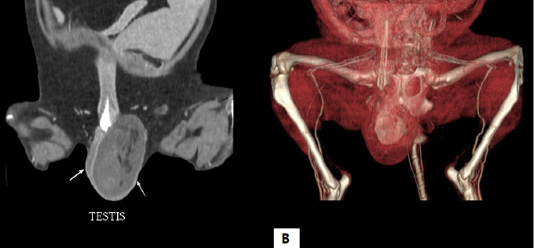 Computed tomography scan of the testicle. (A) Two-dimensional computed tomography scan shows hyperdensity of left testicle and (B) three-dimensional computed tomography scan presents a mass within the left testicle.