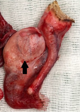 Gross lesion of the surgically removed tissue. A neoplastic mass with a diameter of 1 centimeter was observed in the tunica vaginalis (arrow).