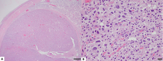 Histopathological lesion of the tumor. (A) An encapsulated neoplastic mass has proliferated and compresed adjacent atrophic seminiferous tubules (H&E stain, Bar = 1mm). (B) Neoplastic cells showed marked nuclear pleomorphism, anisokaryosis, and distinct single nucleolus (H&E stain, Bar = 20 µm).