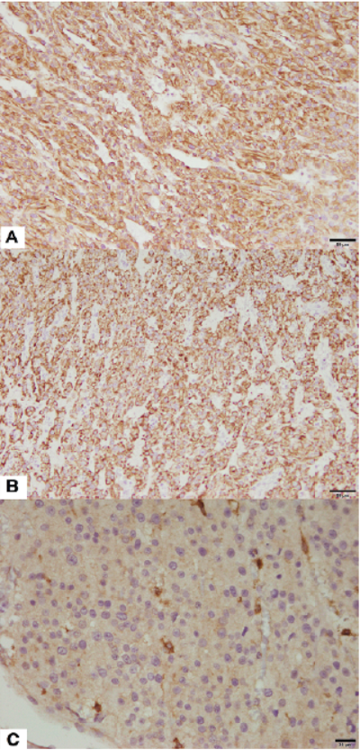 Immunohistochemistry for definite diagnosis of the Leydig cell tumor. Neoplastic Leydig cells showed homogenous positivity for (A) vimentin (Counterstained with Mayer’s hematoxylin, Bar = 50 µm), (B) Melan A (Counterstained with Mayer’s hematoxylin, Bar = 50 µm), and (C) c-kit (CD117) (Counterstained with Mayer’s hematoxylin, Bar = 20 µm).