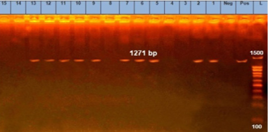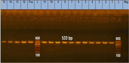 Agarose gel electrophoresis showing pattern of gro EL gene of B. cereus isolates identification. Lane L: 100 bp DNA ladder, lane Neg: the negative control, lane Pos: the positive control (B. cereus ATCC11778), lanes 1-10: PCR amplicons of B. cereus strains from raw milk, lanes 11-15: PCR amplicons of B. cereus strains from pasteurized milk.