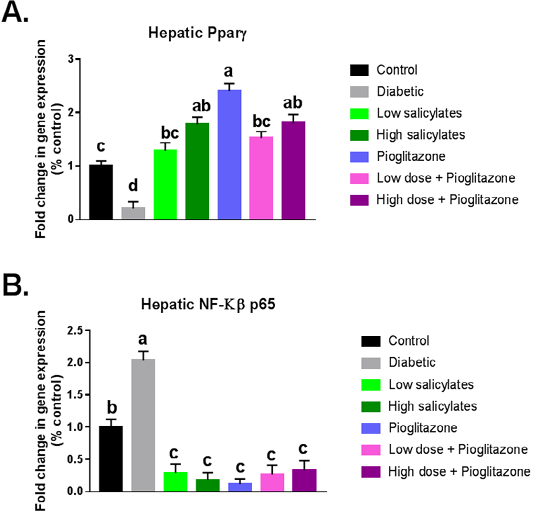 Effect of oral administration of salicylates and/or pioglitazone on hepatic mRNA expression of (a) PPAR-γ and (b) NF-kβp65 in adult male rats. Values are mean±SEM of 8-10 animals per experimental group. Means bearing different superscripts were significantly different at P < 0.05.