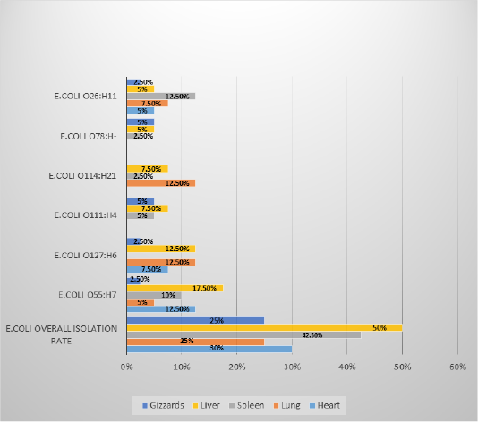 Tissue distribution of the identified E. coli serotypes isolated from ducks. Incidence (%) of the identified E. coli serotypes from different tissues of the diseased ducks collected from Sharkia Governorate, Egypt (n=40).