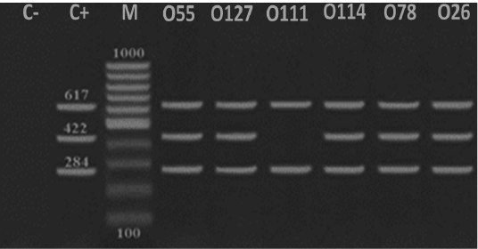 Detection of DNA virulence-associated genes in E. coli serotypes isolated from ducks. A representative DNA gel electrophoresis image for a multiplex PCR reaction for virulence-associated genes including tsh (284 bp), astA (422 bp) and iroN (617 bp) in E. coli serotypes (O55, O127, 0111, O114, O78 and O26). M refers to a 100 bp DNA marker, C- refers to a negative control while C+ refers to a positive control.
