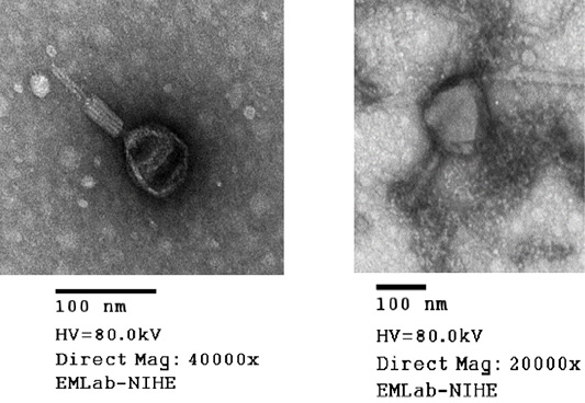 Images of phage virions from the Myoviridae family (A – phage MHH6, B – phage PR2).