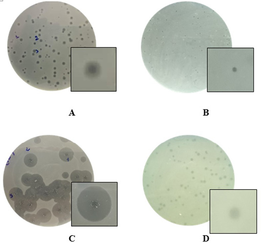 Examples of diversity of phage plaque morphology following morphological types of plaques are shown: plaques with a halo (A); small-sized pin-headed, clear plaque (B); plaques with clear centers and turbid edges (C), and turbid plaque (D).