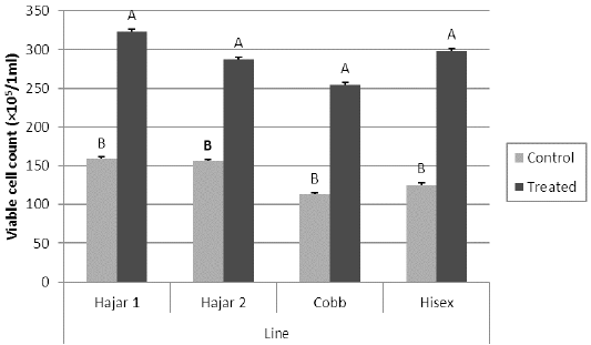 Viable cell count for peripheral blood lymphocytes of different chicken lines stimulated with PHA (50 μg/ml) at 7d of the experiment. a, b columns with different superscript differ significantly (P ≤0. 05). Treated and control are injected and non-injected groups using cytokine- rich supernatant respectively.