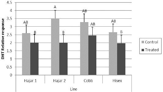 Delayed hypersensitivity test (DHT) relative response to Bovine serum albumin (BSA) of different chicken lines. a, b columns with different superscript differ significantly (P ≤0. 05). Treated and control are injected and non-injected groups using cytokine- rich supernatant respectively.