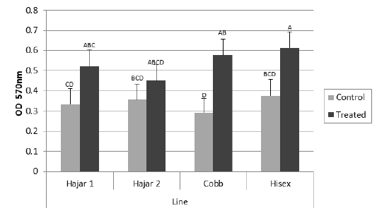 Mean optical density (OD) values of reduced MTT formazan for peripheral blood lymphocytes of different chicken lines stimulated with PHA (50 μg/ml) at 7d of the experiment. a, b, c, d columns with different superscript differ significantly (P ≤0. 05). Treated and control are injected and non-injected groups using cytokine- rich supernatant respectively.