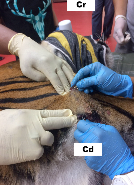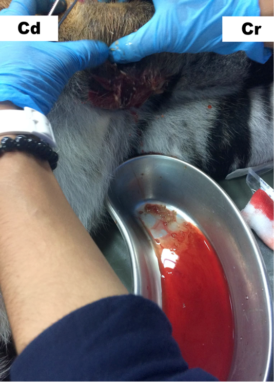 Second incision was made at the cranial part of the hygroma to ensure the entire sac is fully drained and easier to flush to remove all debris accumulated inside the cavity.