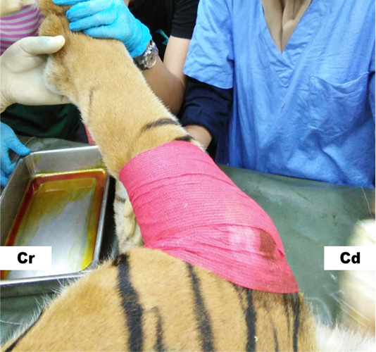 The elbow joint was bandaged with gauze soaked with povidone iodine, cotton and water resistant compressing bandage.