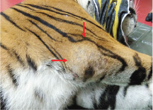 Well demarcated, soft lump caudal to the right forelimb elbow joint (8 cm x 9 cm).
