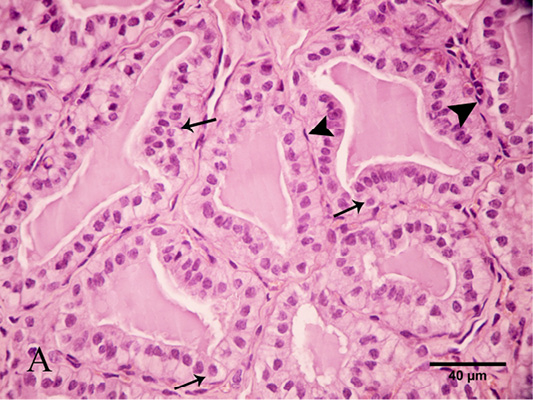 Photomicrograph of thyroid gland showed that parafollicular cells were seen between the follicular cells “arrows”. Note the thyroid follicles were surrounded by myoepithelial cells with flattened nuclei “arrow heads”. Stain: H and E X.400