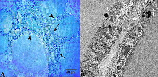 (A) Semithin section of thyroid gland in the summer season showed that thyroid follicles were lined with simple squamous epithelium with flattened nuclei “arrows” but some of them had low cuboidal epithelium “arrow heads”. (B) Ultrastructural characters showed that the thyroid follicles had flattened cells with an electron-dense cytoplasm and heterochromatic nuclei “N”, colloid droplets “C” and lysosomes “L”, these follicles were separated by interfollicular connective tissue “asterisk”. Stain:(A) Toluidine blue X.400.