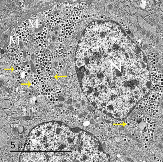 An electron micrograph of thyroid gland, showed that parafollicular cells had large and central nuclei “N”, elongated mitochondria “M” and darkly stained granules “arrows”.