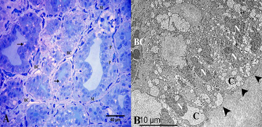 (A) Semithin section of thyroid gland in the winter season showed the thyroid follicles had high cuboidal epithelium, parafollicular cells in between “P” and vacuolated colloid “arrow”. They were surrounded by myoepithelial cells “M”. Note the thyroid follicles were surrounded by several blood capillaries “BC”. (B) Ultrastructural characters showed that the thyroid follicles had high columnar follicular cells “arrowheads” with heterochromatic nuclei “N” and several colloid droplets “C”. Note the blood capillary “BC”. Stain: (A) Toluidine blue X.400.