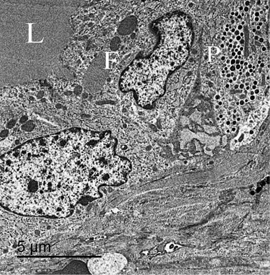 An electron micrograph of thyroid gland, showed that the parafollicular cells “P” present below follicular cells “F” and not reach the follicular lumen “L”.
