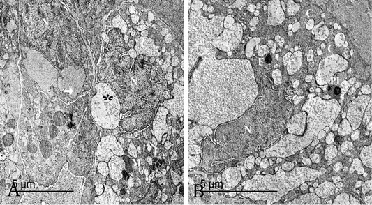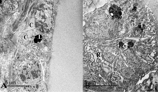 (A) An electron micrograph of thyroid gland in the summer season, showed that thyroid follicles were lined with flattened epithelium containing heterochromatic nuclei “N”, round lysosomes “L” and some colloid droplets “C”. (B) Follicular cells were low cuboidal in shape with heterochromatic nuclei “N”, lysosomes “L” and some rough endoplasmic reticulum “R”.