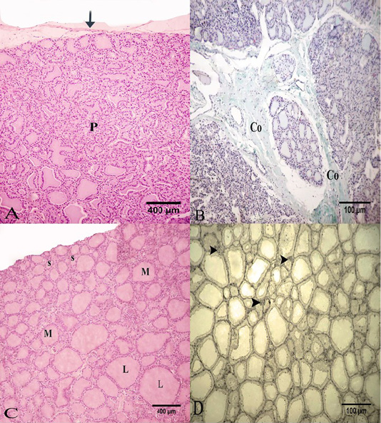 Photomicrograph of the goat’s thyroid gland showed that (A) Thyroid gland parenchyma “P” was surrounded by of a connective tissue capsule “arrow”. (B) Some connective tissue septa had mainly collagen fibers “Co”. (C) The parenchyma formed from several follicles; small “S”, medium “M” or large “L” in size. (D) The interfollicular connective tissue had little reticular fibers “arrow heads”. Stain: (A and C) H and E (B) Crossmon’strichrome (D) Silver impregnation (A and C) X.50, (B and D) X.100