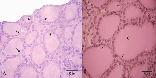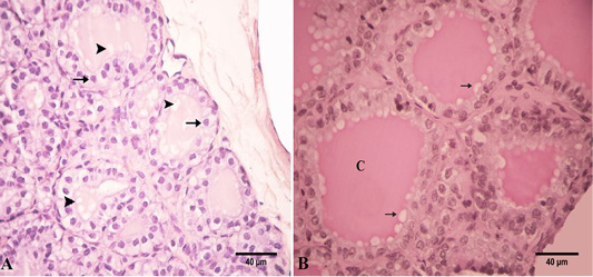 Photomicrograph of the goat’s thyroid gland showed that (A) In the winter season, thyroid follicles had high cuboidal epithelium with round nuclei “arrows”. These follicles had a vacuolated colloid “arrowheads”. (B) These follicles had a PAS-positive highly vacuolated “arrows” colloid “C”. Stain: (A) HandE (B) PAS X.400.