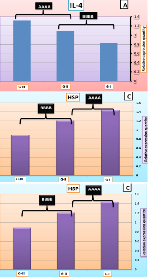 IL-4 (A), IL-12 (B), and HSP (C) mRNA quantification in the larval extract of L. vannamei feed on synbiotics at the end of the 60 days experimental period. Values are mean + SE, n = 3.