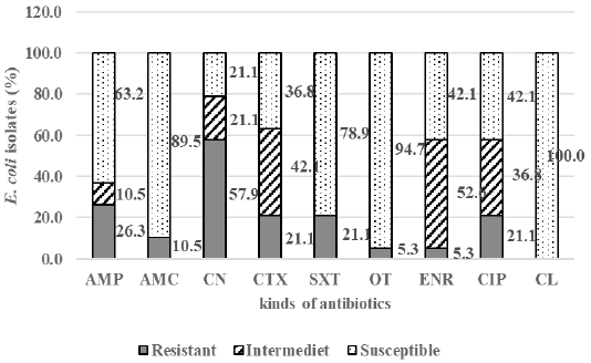 The percentage of E. coli susceptible, intermediate, and resistant in Döner kebab meat sold at Dramaga Bogor; ampicillin (AMP), amoxicillin-clavulanate (AMC), enrofloxacin (ENR), cefotaxime (CTX), trimethoprim-sulfamethoxazole (SXT), oxytetracycline (OT), gentamicin (CN), ciprofloxacin (CIP), and chloramphenicol (CL).