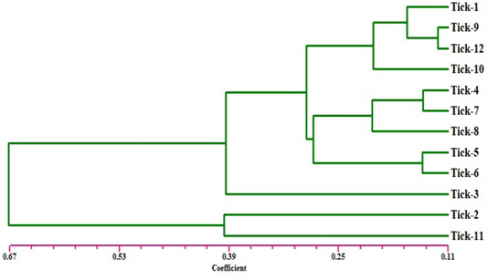 Dendrogram analysis showing relationship of the twelve samples of Hyalomma dromedarii based on ISSR marker using Jaccard’s similarity coefficient. Individuals from 1 to 4 are from farm number 1 and individuals 5 to 8 from farm number 2, while individuals 9 to 12 from farm number 3.